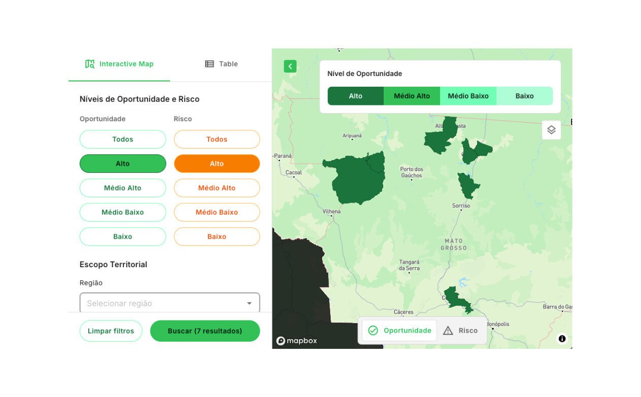 Alternando entre as visualizações de mapa e tabela, o usuário identifica Alta Floresta como o município com o perfil de risco/oportunidade mais relevante e a localização mais estratégica.