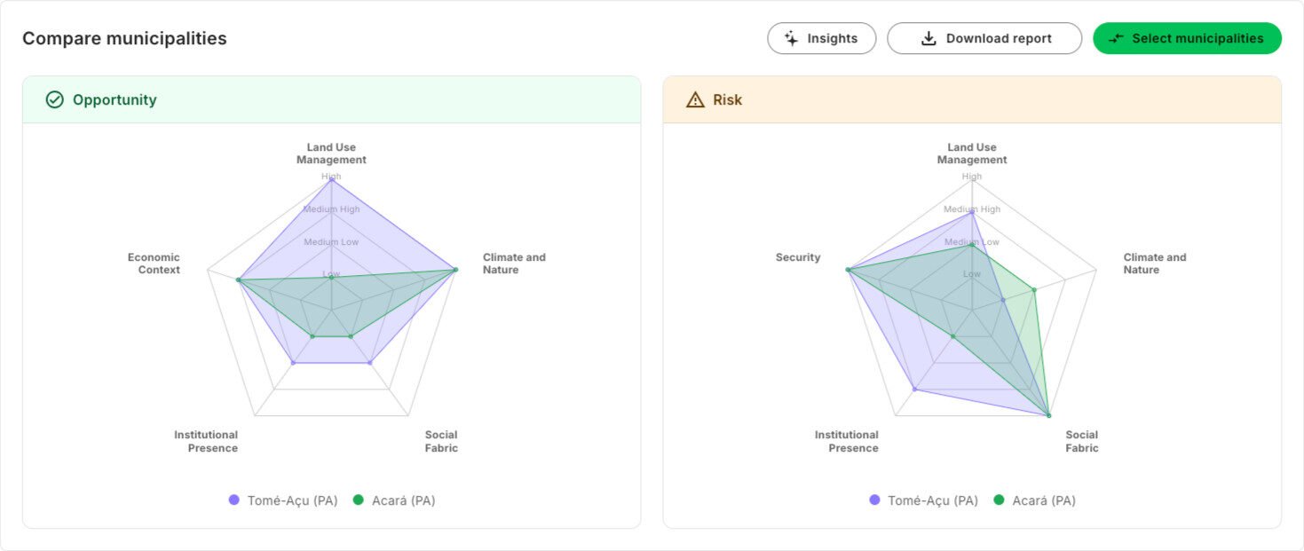 When the user brings together all the dimensions, a clearer picture emerges. Tomé-Açu combines stronger opportunities in land use, social fabric, and, especially, institutional presence, while simultaneously concentrating greater environmental pressure and certain institutional and social risks. The municipality resembles a territory of high opportunity and higher complexity, requiring a firm commitment to mitigating risks across a greater number of dimensions. Acará presents more modest opportunities overall, slightly higher climate and conflict risks, and more complex overlaps between private areas and protected or settlement territories.